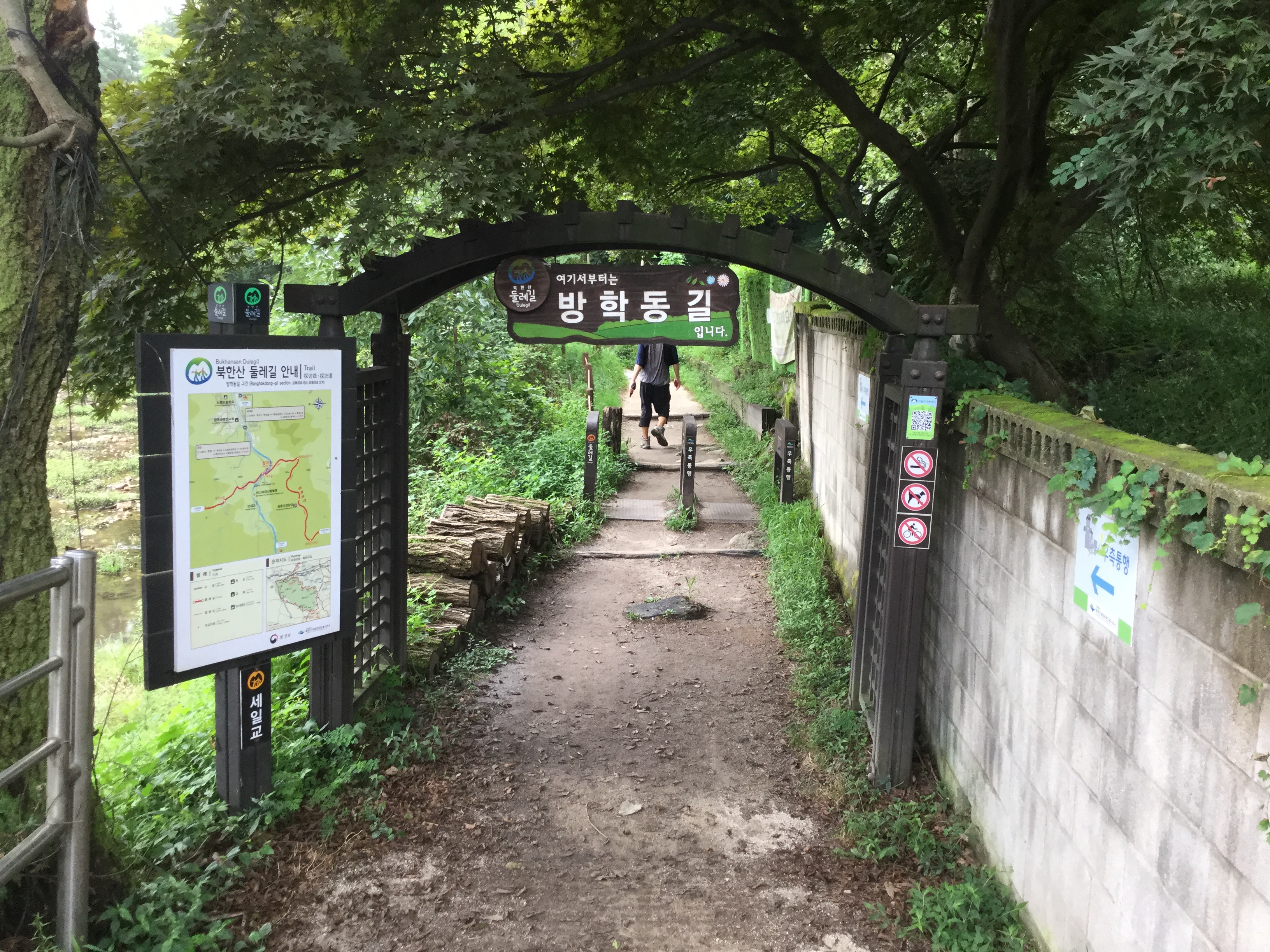 하천변 산책로와 무수히 전하길 안내판이 있는 곳