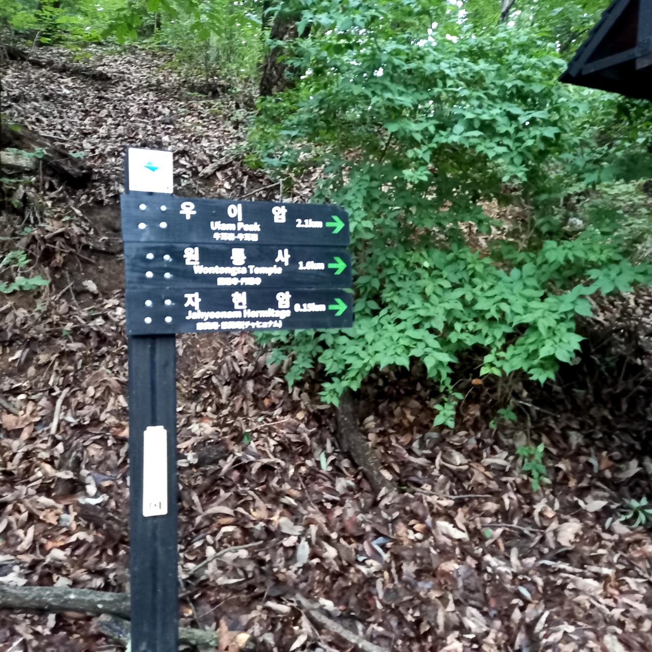 9시 43분, 무수골공원지킴터에 이른다. 사람은 없는데 폭염특보 시 식염포도당을 제공한다는 자막이 명멸한다. 이정표가 가르치는 오른쪽 언덕길을 올라 자현암으로 향한다. 왼쪽 길섶의 숲에서 신록(生)과 조락(凋落)이 공존하는 현장을 본다.