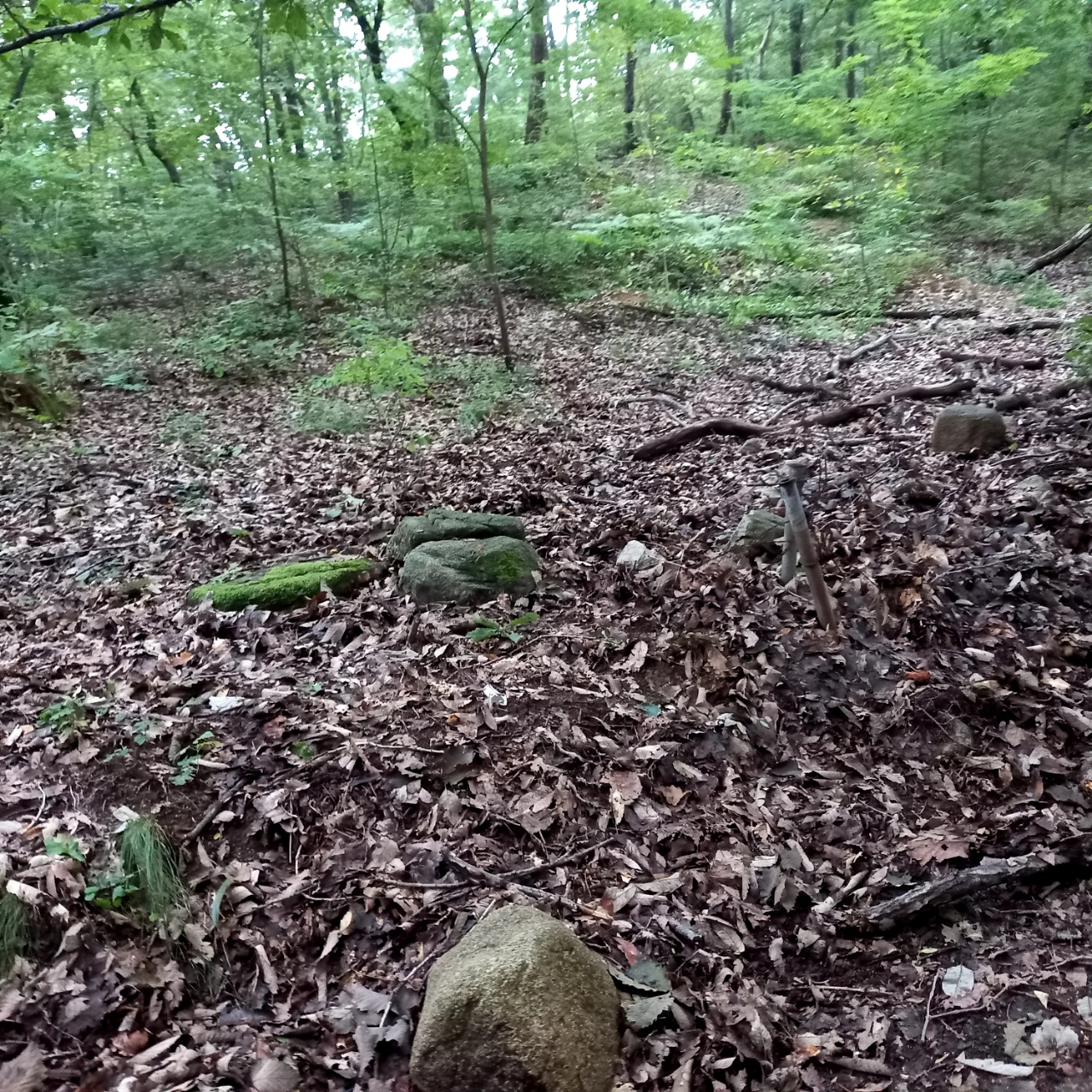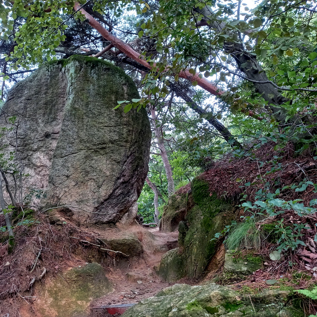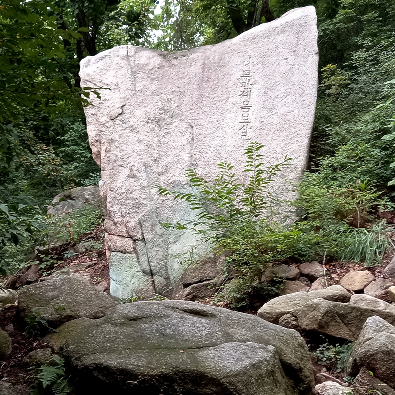 산길이 서서히 가팔라지며 계곡이 깊어진다. 인적이 없는 괴괴한 산속을 혼자 걷자니, 멧돼지라도 나오면 큰일이겠다는 생각에, 겁이 덜컥 난다. 아마도 누군가가 성황당을 만들려 했던 곳을 지난다, 이제 무수곡은 왼쪽으로 흐르고 계곡 옆에 나무관세음보살이 새겨진 돌판지 같은 입석이 우뚝한 곳을 만난다.